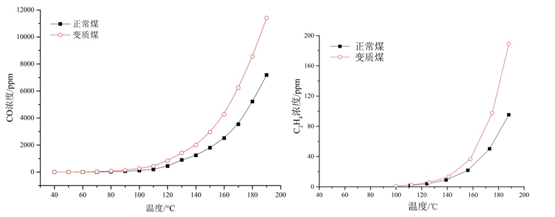 由表 4 實驗室測定不同變質(zhì)程度的煤樣自燃傾向性指標(biāo)參數(shù)可以看出,原生煤與變質(zhì)煤均為Ⅰ類容易自燃煤層; 30 ℃煤的吸氧量表現(xiàn)為原生煤大于變質(zhì)煤;但在反應(yīng)溫度達(dá)到 70 ℃時,變質(zhì)煤對于氧氣的消耗速率大于原生煤;結(jié)合衡量溫升速率快慢的交叉點溫度指標(biāo),體現(xiàn)為變質(zhì)煤較原生煤加速氧化階段的氧化自燃特性更強烈;計算煤氧化動力學(xué)綜合指標(biāo)判定指數(shù)表明火成巖侵入破壞使得變質(zhì)煤較原生煤具有更高的自然發(fā)火的風(fēng)險。由圖 2 對比分析可以看出變質(zhì)煤較原生煤在低溫氧化階段標(biāo)志性氣體產(chǎn)出溫度低,變現(xiàn)了變質(zhì)煤更易發(fā)火的實踐經(jīng)驗。