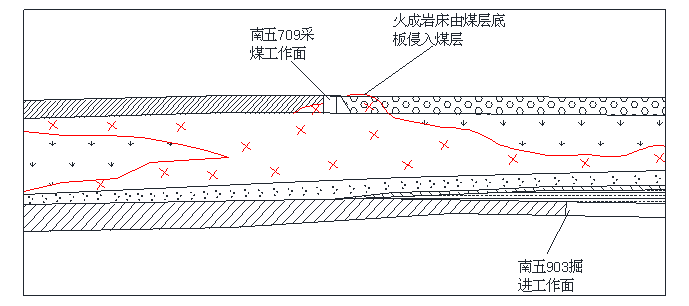 如圖 4 ,在南五 709 回采過程中工作面遇到火成巖沿煤層底板侵入煤體時,揭露的構(gòu)造體向工作面涌入瓦斯,造成回風(fēng)斷電中斷生產(chǎn),統(tǒng)計發(fā)現(xiàn)在停產(chǎn)面風(fēng)排瓦斯量增加 4m3/min 。與其同向推進(jìn)的南五 903 掘進(jìn)工作面在施工底板錨索時,鉆孔位于火成巖床體內(nèi)時發(fā)生瓦斯噴出,造成回風(fēng)斷電中斷生產(chǎn),統(tǒng)計發(fā)現(xiàn)風(fēng)排瓦斯量增加 4m3/min 。巖漿在侵入過程中,破壞地層同時也在冷卻收縮易形成賦存瓦斯的裂隙,巖床下煤層受熱烘烤作用,瓦斯向上運移、富集在多孔的火成巖床內(nèi),采煤和打鉆作業(yè)破壞了蓋儲條件,對瓦斯富集區(qū)形成“天窗”出口,從而瓦斯大量異常涌出。