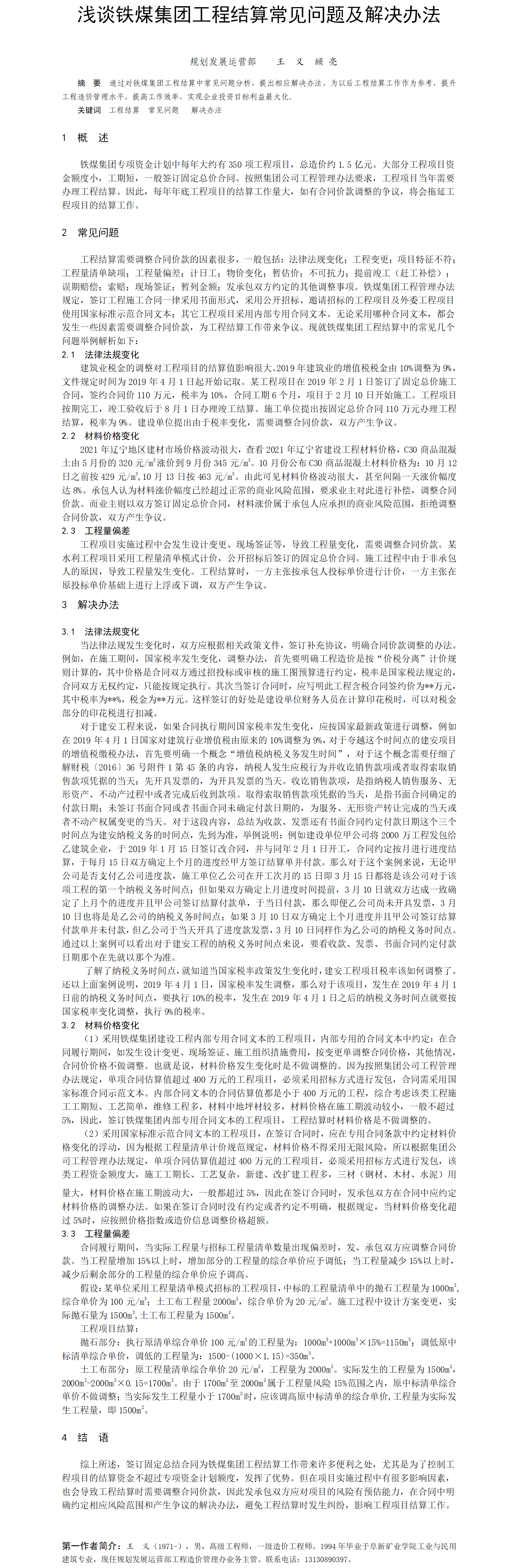 第55屆等級(jí)獎(jiǎng)?wù)撐?--淺談鐵煤集團(tuán)工程結(jié)算常見問題及解決辦法